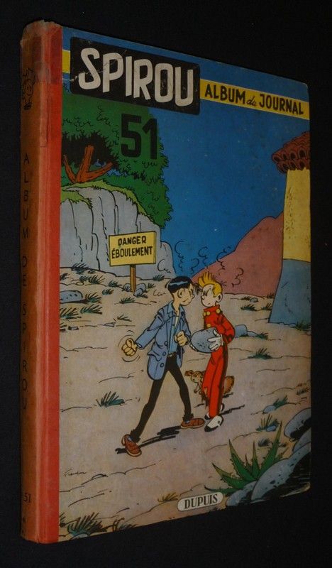In-4 (20 x 28,5 cm), album cartonné, 1er plat illustré, album n°51 du journal Spirou, comprenant les numéros 860 (7 octobre 1954) à 872 (30 décembre 1954) ; dos insolé, ruban adhésif aux mors en tête et à la coiffe supérieure, coupes frottées, assez bon état général.
