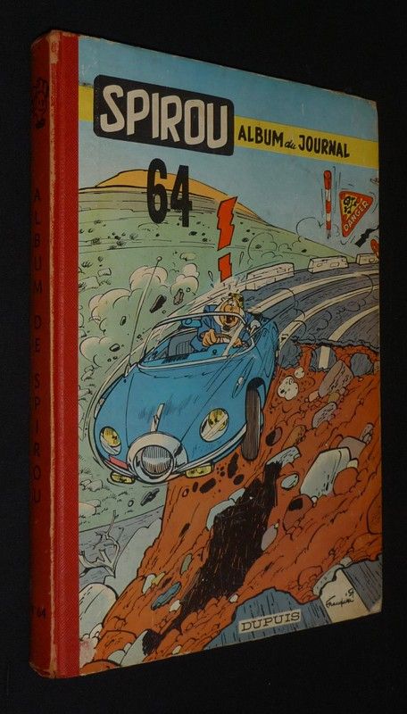 In-4 (20,5 x 29 cm), album cartonné, 1er plat illustré, album n°64 du journal Spirou, du n°1019 (24 octobre 1957) au 1028 (26 décembre 1957) ; mors et coupes frottés, ruban adhésif aux coins, tache et marques d'usage au quatrième plat, assez bon état général.