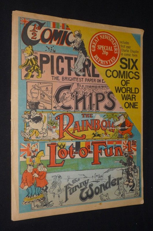 In-folio (29 x 38 cm), journal en feuilles, texte en anglais, compilation de 6 bandes dessinées de la Première Guerre mondiale : THE RAINBOW, No. 168, vol.4, April 28 1917 // PICTURE FUN, No. 307, vol.IX, December 26, 1914 // COMIC LIFE, No. 893, July 31, 1915 // THE FUNNY WONDER, Vol. II - No. 72, week ending August 7, 1915) // LOT-O'-FUN, Vol. XVIII, No. 453, November 14, 1914 // ILLUSTRATED CHIPS, No. 1477, December 21, 1918 ; dos et bords des plats un peu usés, papier bruni, bon état.
