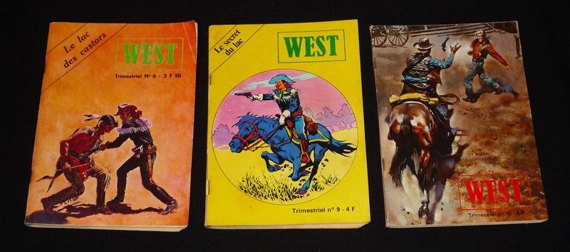 Trois volumes in-12 (12,5 x 17,5 cm), dos agrafé, lot de 3 numéros de la série "West" : n°6 (avril 1979) : Le lac des castors // n°9 (janvier 1980) : Le Secret du lac // n°10 (avril 1980) : Buffalo Bill : La grotte du pic ; quatrièmes plats défraîchis, dos du n°9 frotté, coin corné au premier plat du n°6, assez bon état.