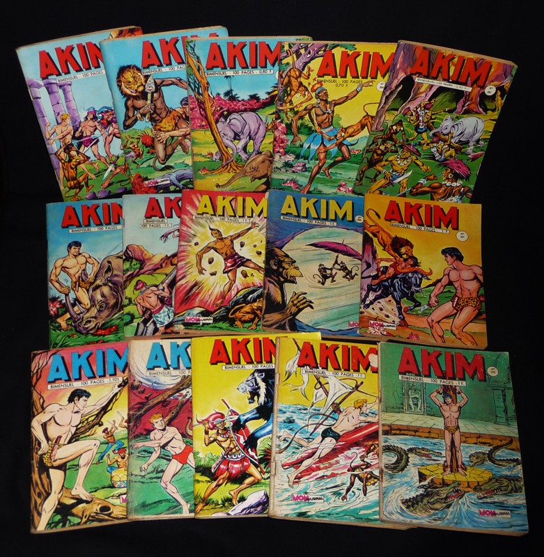 In-12 (13 x 18 cm), dos agrafé, lot de 15 numéros du périodique "Akim", bande dessinée en noir et blanc, ce lot comprend les numéros suivants : 201 / 204 / 207 / 209 / 212 / 221 / 234 / 236 / 237 / 239 / 248 / 250 / 252 / 274 / 279 ; pliures, frottements et déchirures sur les plats (plus ou moins importantes selon le numéro), épidermure papier au premier plat du n°250, état moyen.
