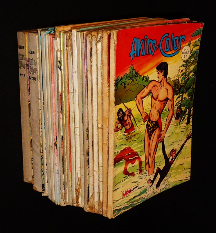 in-12 (15 x 21 cm), dos carré collé, lot de 17 numéros et 2 albums du périodique "Akim Color", bande dessinée en couleurs, ce lot comprend les numéros suivants : n°16 / 33 / 49 / 55 / 56 / 62 / 79 / 81 / 82 / 90 / 92 / 93 / 98 / 99 / 100 / 101 / 102 / album n°12 (contenant les n°34 à 36) et n°20 (contenant les n°58 et 59 + "Pistes sauvages" n°10) ; traces, incidents, frottements et pliures sur l'ensemble du lot (plus ou moins importants selon le numéro), dos déchiré aux n°81 et 82, 4e plat manquant au n°92, manque au premier plat et 4e plat sali au n°93, manque au quatrième plat au n°100, état moyen.