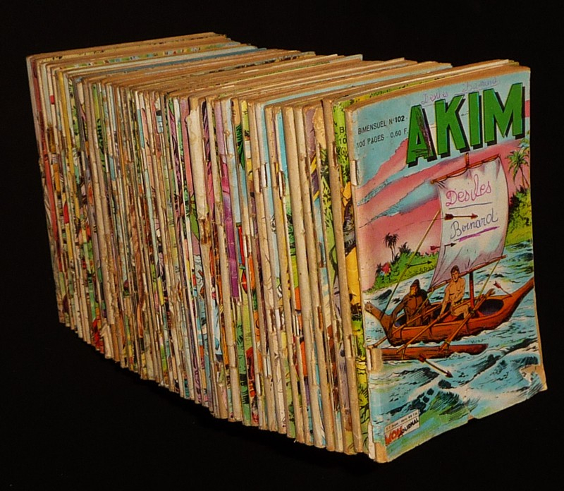 in-12 (13 x 18 cm), dos agrafé, lot de 51 numéros du périodique "Akim", bande dessinée en noir et blanc, ce lot comprend les numéros suivants : 102 / 103 / 107 / 110 / 111 / 112 / 113 / 114 / 115 / 116 / 118 / 121 / 123 / 124 / 126 / 127 / 130 / 131 / 134 / 135 / 136 / 137 / 138 / 140 / 141 / 142 / 143 / 145 / 146 / 148 / 149 / 150 / 151 / 152 / 154 / 155 / 156 / 157 / 158 / 160 / 161 / 162 / 163 / 164 / 166 / 167 / 170 / 171 / 172 / 173 / 174 ; dos frottés, traces, pliures et quelques déchirures aux plats (plus ou moins importants selon le numéro), quelques salissures et notes manuscrites sur les plats de certains numéros, dos rongé aux n°154 et 157, plats froissés aux n°158 et 164, manque au premier plat du n°130, quatrième plat sali au n°114, état moyen.