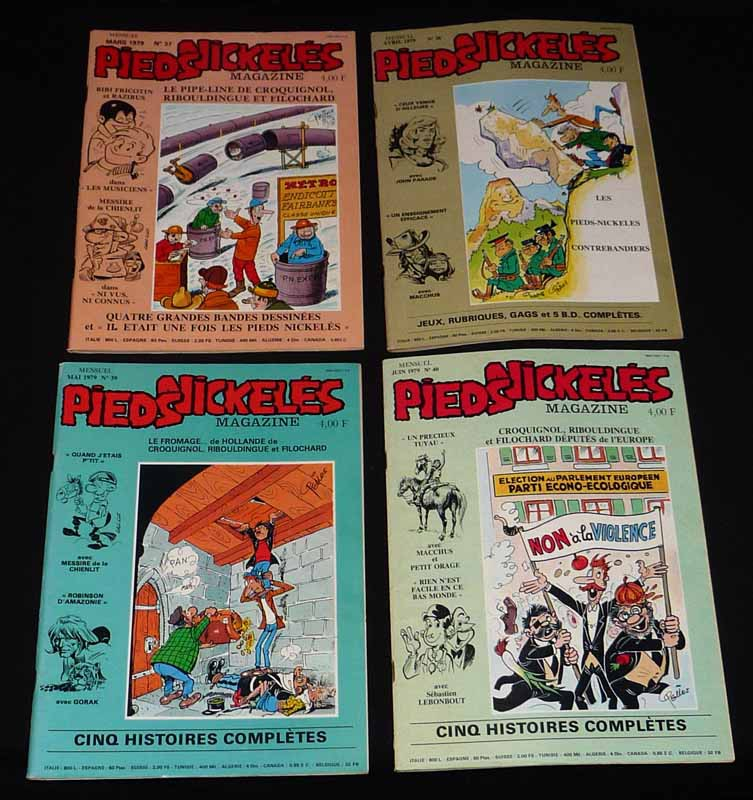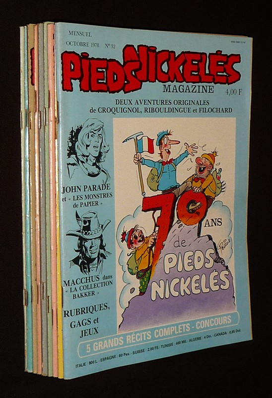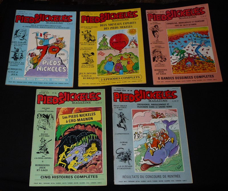 In-4 (19 x 26 cm), dos agrafé, lot de 9 numéros à suivre de Pieds Nickelés Magazine, du n°32 (octobre 1978) au n°40 (juin 1979) ; dos un peu frottés, quelques traces et marques de frottement aux plats, par ailleurs assez bon état.