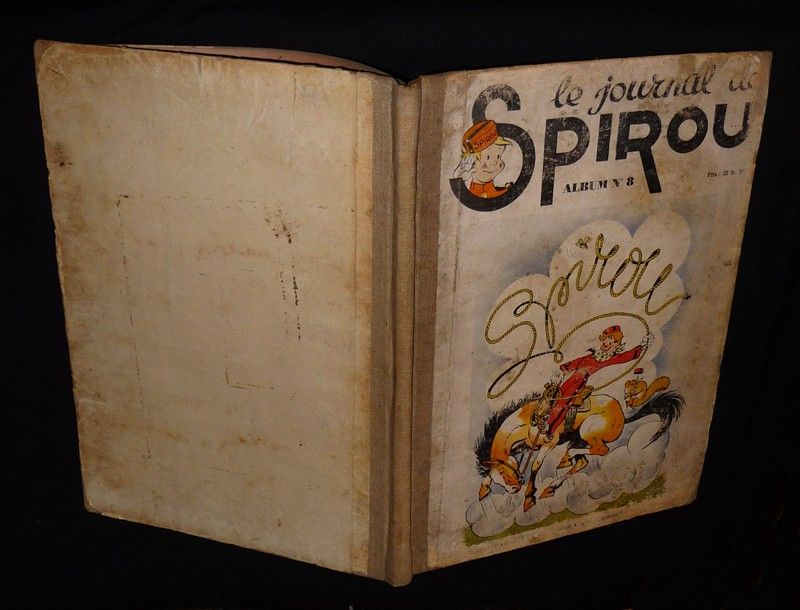 RARE. In-folio (29 x 40 cm), album cartonné, dos toilé, premier plat illustré, album n°8 du Journal de Spirou, contenant les numéros 10 au n°29 (4e année,1941) ; coupes et premier plat frottés, traces sur les plats, page 1-2 du n°10, manque dans le coin inférieur de la page 3-4, état moyen.