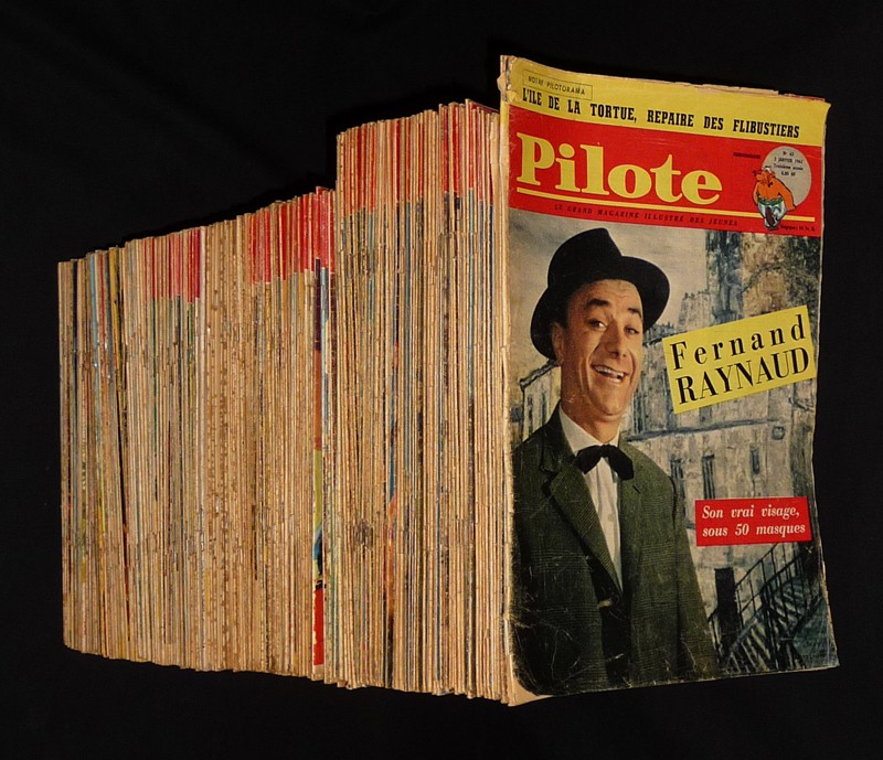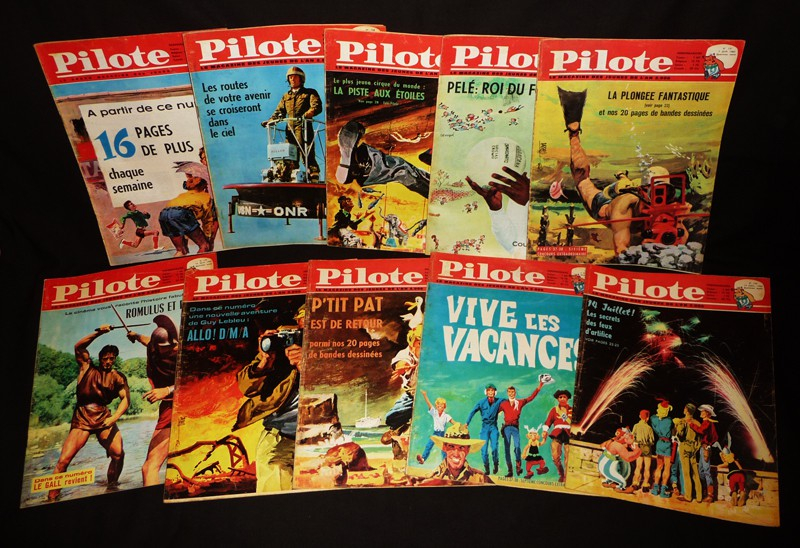 In-4 (26,5 x 38,5 cm, 26,5 x 35,5 cm et 24 x 32 cm), dos agrafé, lot de 255 numéros de la revue "Pilote : du n°63 (5 janvier 1961), au n°166, du n°168 au n°228, du n°230 au n°237, du n°239 au n°244, du n°246 au n°270, du n°287 au n°290, du n°298 au n°303 et du n°306 au n°346 (9 juin 1966) ; dos frottés, plats plus ou moins usés selon le volume (frottements, pliures et petites déchirures), certains numéros sont fragilisés, par ailleurs assez bon état général.