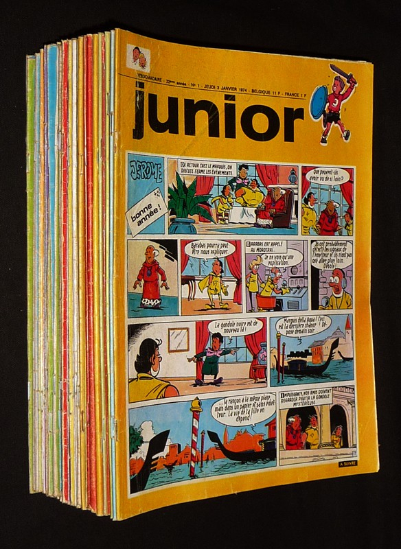 In-4 (21 x 28,3 cm), dos agrafés, lot de 41 numéros de la revue "Junior" de 1974 (22e année) : du n°1 (3 janvier 74) au n°5 / 7 à 12 / 14 à 24 / 26 / 27 / 36 à 52 (26 décembre 74) ; dos frottés, traces, pliures et frottements aux plats plus ou moins importants selon le numéro, par ailleurs assez bon état général.