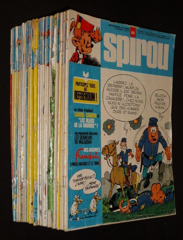 In-4 (21 x 28,5 cm), dos agrafé, lot de 10 numéros de la 24e année et 1 numéro de la 25e année du journal "Tintin" : n°1211 / 1226 / 1228 / 1229 / 1232 / 1233 / 1244 / 1253 / 1257 / 1261 /...