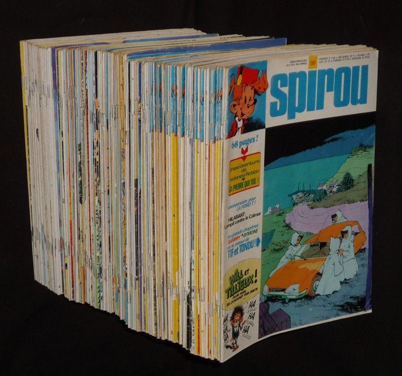 In-4 (20,2 x 27 cm), dos agrafé, lot de 122 numéros de la revue Spirou, du n°1988 (20-5-76) au n°2112 (5-10-78), SAUF les numéros 2029, 2030 et 2099 ; marques d'usage plus ou moins prononcées selon le numéro, assez bon état général.