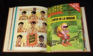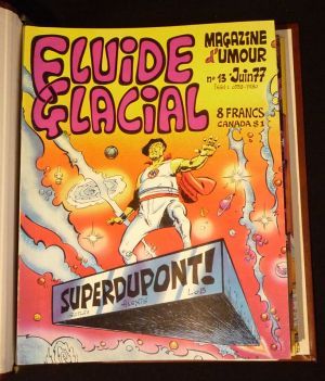 TRES BEL ETAT. In-4 (23,5 x 30,5 cm), revue en RELIURE D'EDITEUR, dessin (autoportrait) de Gotlib doré au premier plat, ce volume regroupe les numéros 13 à 24 (soit 12 numéros) de "Fluide Glacial", revue fondée en 1975 par Marcel Gotlib, Alexis et Jacques Diament ; très bel état.