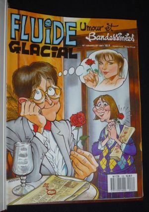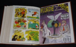 TRES BON ETAT. In-4 (23,5 x 30,5 cm), revue en RELIURE D'EDITEUR, dessin (autoportrait) de Gotlib doré au premier plat, ce volume regroupe les numéros 133 à 144 (soit 12 numéros) de "Fluide Glacial", revue fondée en 1975 par Marcel Gotlib, Alexis et Jacques Diament ; très bon état général.