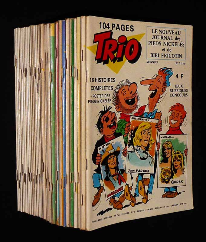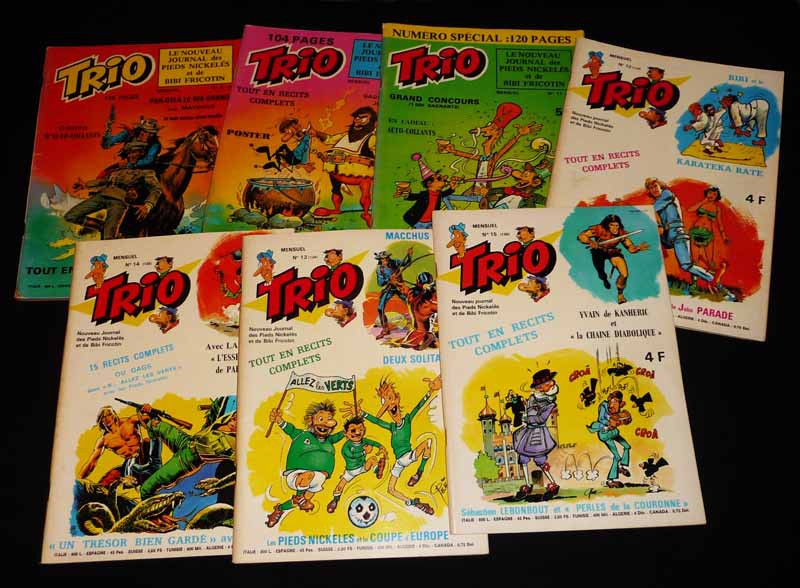In-4 (19 x 26 cm), dos agrafé, n°1 (mars 1976) à 31 (septembre 1978) de la revue "Trio", le journal des Pieds Nickelés et de Bibi Fricotin ; dos un peu frottés, quelques froissements, frottements et marques d'usage sur les plats (plus ou moins importants selon le numéro, et plus prononcés sur les plus anciens), pliures au premier plat du n°5, petite déchirure sans manque au premier plat du n°9, par ailleurs bon état d'ensemble.