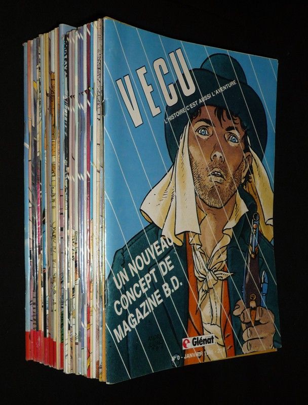 In-4 (21 x 28,7 cm et 23 x 30 cm), dos agrafé, lot de 30 numéros de la revue de bande dessinées "Vécu", du n°0 au n°29 (1985-1987) ; quelques frottements aux plats (plus ou moins selon le volume), par ailleurs assez bel état.