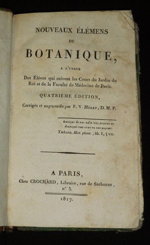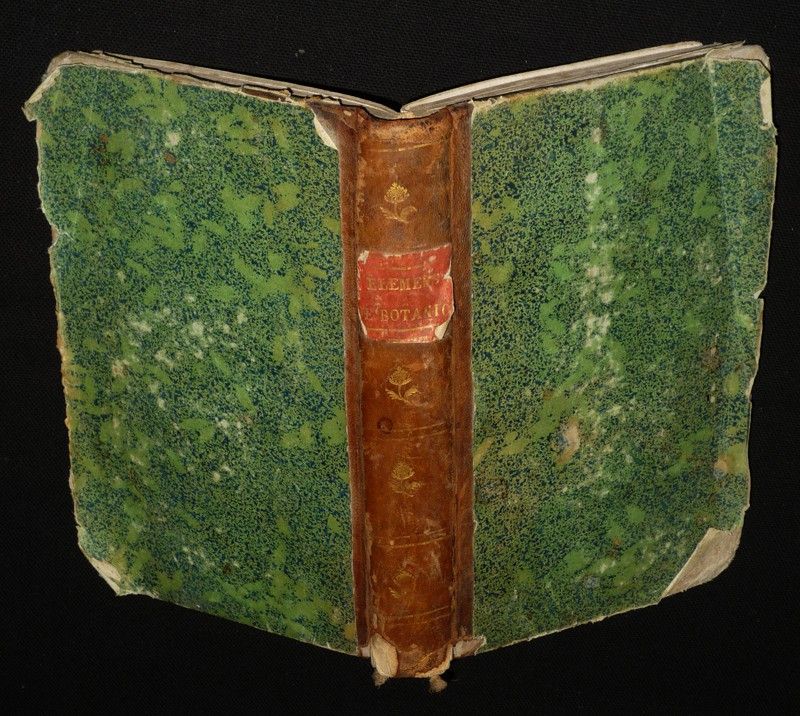 In-12 (10,7 x 17,2 cm), reliure demi-peau, dos lisse, xx-386 pages ; reliure abîmée (manque de cuir au dos en queue papier reliure décollé aux plats, coupes usées, coins émoussés, note manuscrite en première garde et en page de faux titre), mouillure dans le coin inférieur du corps d'ouvrage, en l'état.