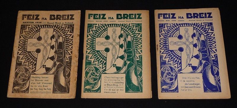 In-8 (de 14,7 x 20,5 cm), dos agrafés, 3 numéros de "Feiz ha Breiz" de 1938 : n°1 (Genver), n°3 (Meurz), n°5 (Mae) ; rousseurs aux plats et bords usés au n°1, par ailleurs assez bon état.