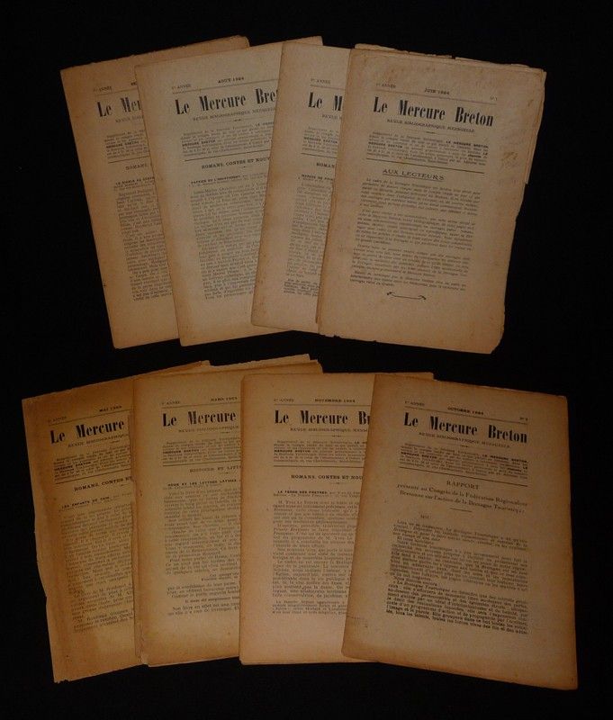 In-4 (16,5 x 25,2 cm), revue en feuilles, 16 pages par numéro, ici les numéros 1 à 12 soit l'intégralité de la revue "Le Mercure Breton" parue de juin 1924 à mai 1925 ; papier bruni, dos et bords plus ou moins abîmés selon le numéro, assez bon état.