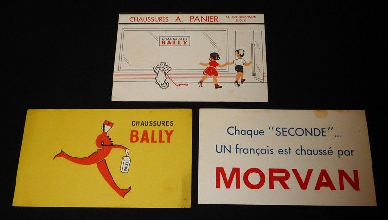 Lot de 3 buvards publicitaires pour des marques de chaussures : "Chaque 'seconde' un français est chaussé par Morvan" // "Chaussures Bally" // "Chaussures Bally / Chaussures A. Panier, Besançon"...