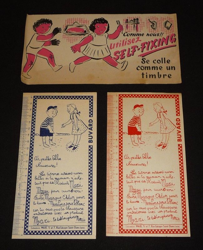 Lot de 3 buvards publicitaires pour des marques de produits ménagers : "Comme nous, utilisez Self-Fixing - se colle comme un timbre" [bords latéraux recourbés, rousseurs au recto] // "Laboratoires Maxi" version rouge et version bleue [bel état].