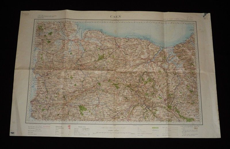 Carte en couleurs (78 x 51 cm), du Calvados / région de Caen, échelle 1:200.000, sans date ; déchirures dans les coins et le long d'une pliure, quelques traces et pliures dans les marges, par ailleurs assez bon état général.