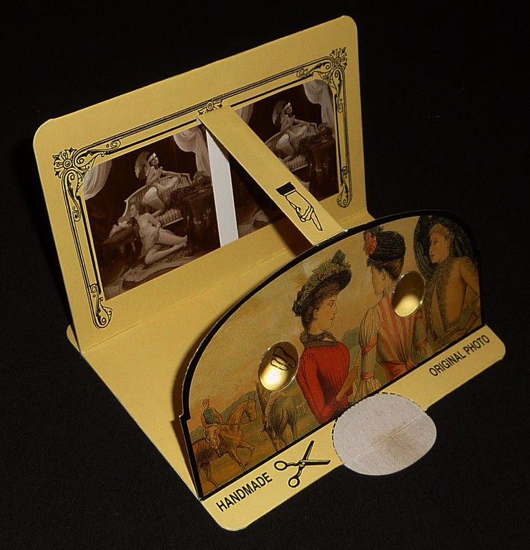 Carte postale érotique dépliante avec système de lunettes 3D intégré, photographie en noir et blanc, sans date, provenance République Tchèque ; "Praque" et date manuscrite au verso, par ailleurs bon état.