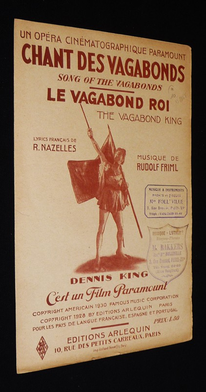 In-4 (17,5 x 27,5 cm), partition pour chant en feuilles, 4 pages, "Chant des Vagabonds" tiré de l'opérette "Le Vagabond Roi", paroles françaises de René Nazelles, musique de Rudolf Friml ; tampons au premier plat, bon état général.