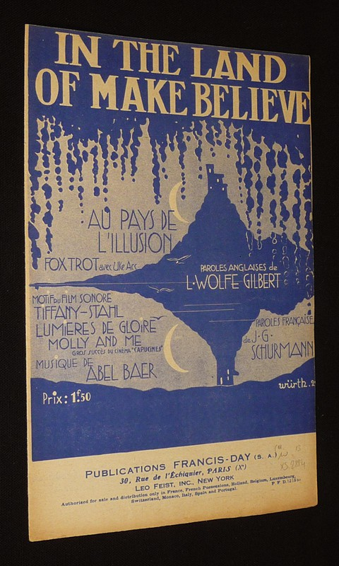 In-4 (17,5 x 27 cm), partition en feuilles pour chant, 4 pages, "In the Land of Make Believe", en français "Au pays de l'illusion", motif du film sonore "Lumières de gloire", avec les paroles anglaises de L. Wolfe Gilbert, les paroles françaises de J. G. Schurmann, et la musique de Abel Baer ; bel état.
