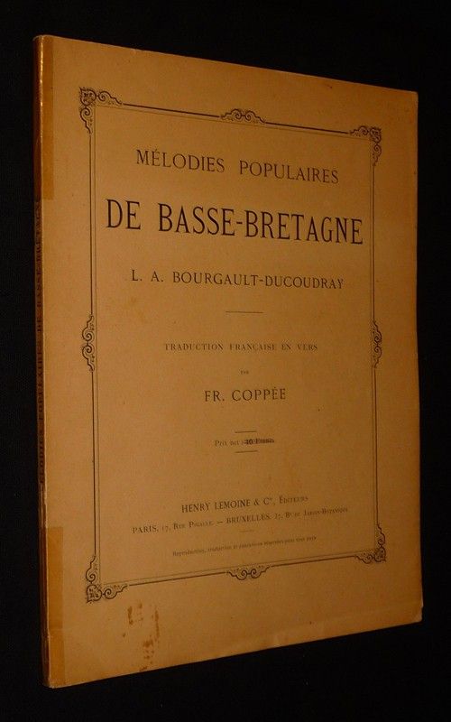 In-4 (22,5 x 30,2 cm), broché, 18 pages de texte suivies de 115 pages de partitions, réimpression de 1959 ; réparation au ruban adhésif aux mors, quelques traces et une pliure au premier plat en queue, par ailleurs assez bon état général.