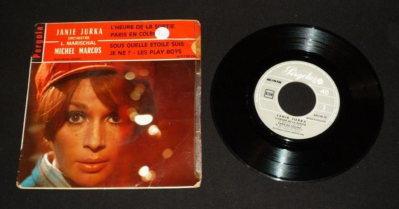 Disque vinyle 45 tours de Janie Jurka et Michel Marcos, comprenant les chansons : L'Heure de la sortie - Paris en colère - Sous quelle étoile suis-je né ? - Les Playboys ; pochette un peu abîmée (bords frottés, coins cornés, traces et note manuscrite à l'arrière), quelques marques d'usage qui ne devraient pas empêcher la lecture sur le disque lui-même, par ailleurs assez bon état général.