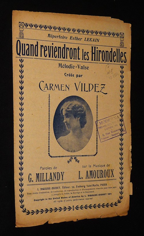 In-4 (17,5 x 27,5 cm), partition chant en feuilles, 4 pages, "Quand reviendront les hirondelles", mélodie-valse créée par Carmen Vildez, paroles de G. Millandy sur la musique de L. Amouroux ; petites déchirures sur les bords, tampon au premier plat, par ailleurs assez bon état.