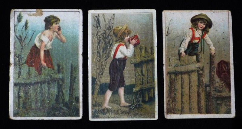 3 chromos publicitaires (6,8 x 11,2 cm) de la même série éditée par la maison Cothenet-Tardy, représentant des enfants dans un milieu campagnard ; bords frottés, traces et marques d'usage sur les vignettes, état moyen.
