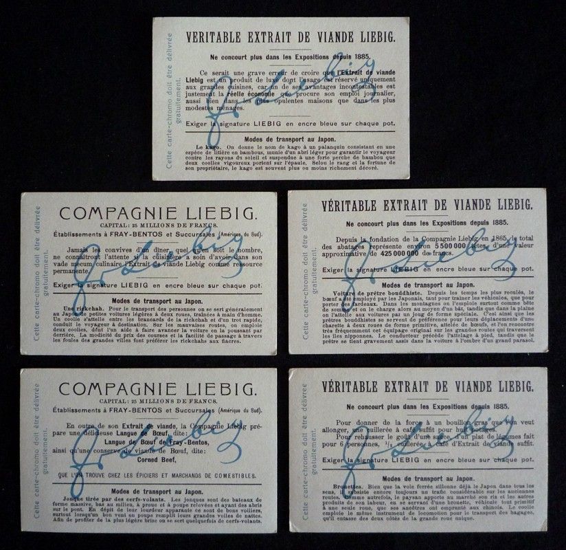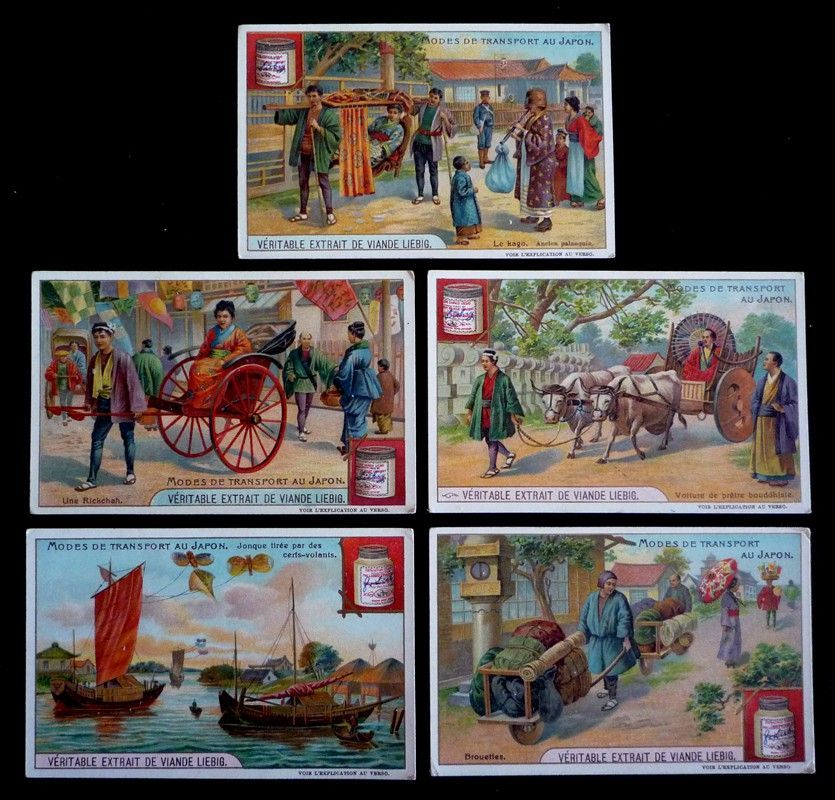 5 (sur 6) chromos publicitaires (11 x 7 cm) éditées par la marque Liebig, série "Modes de transport au Japon", comprenant les vignettes suivantes : kago ; voiture de prêtre bouddhiste ; brouettes ; rickchah ; jonque tirée par des cerfs-volants ; coins légèrement frottés, par ailleurs bel état.