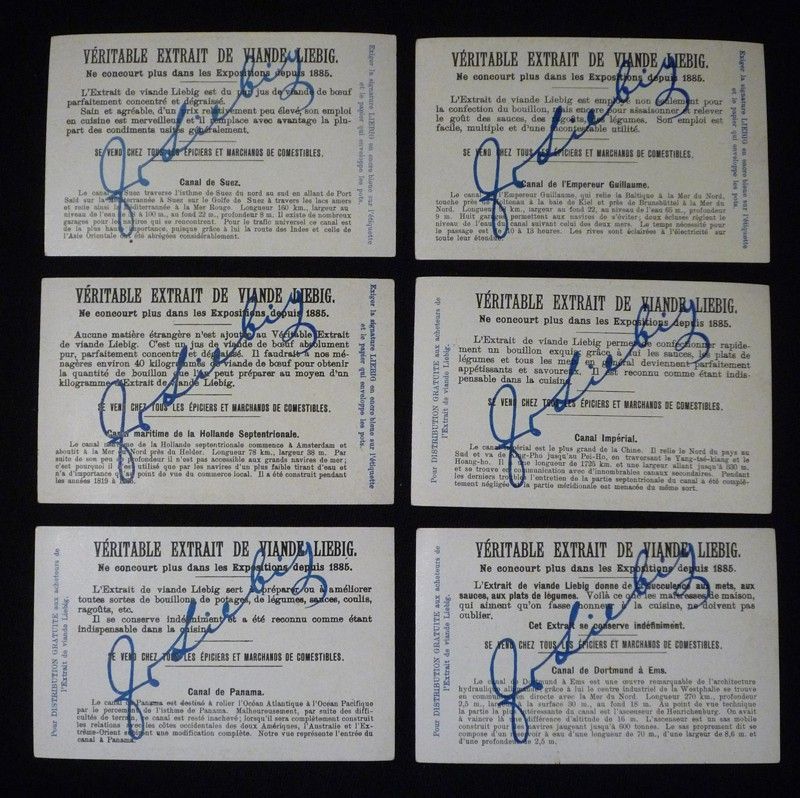4 (sur 6) chromos publicitaires (11 x 7 cm) éditées par la marque Liebig, série de problèmes mathématiques avec solution au dos ; vignettes légèrement défraîchies, bon état général....