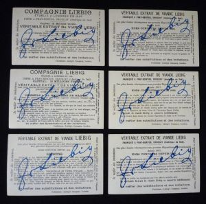 6 chromolithographies publicitaires (10,4 x 7 cm) éditées par la marque Liebig, série complète de scènes historiques, religieuses et mythologiques autour d'animaux, comprenant les vignettes...