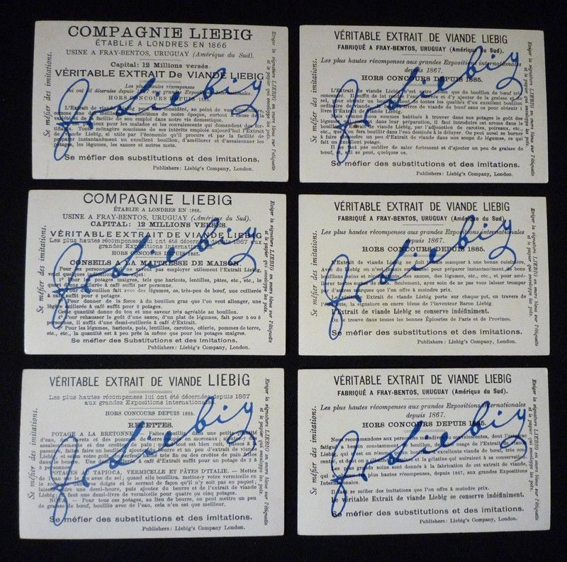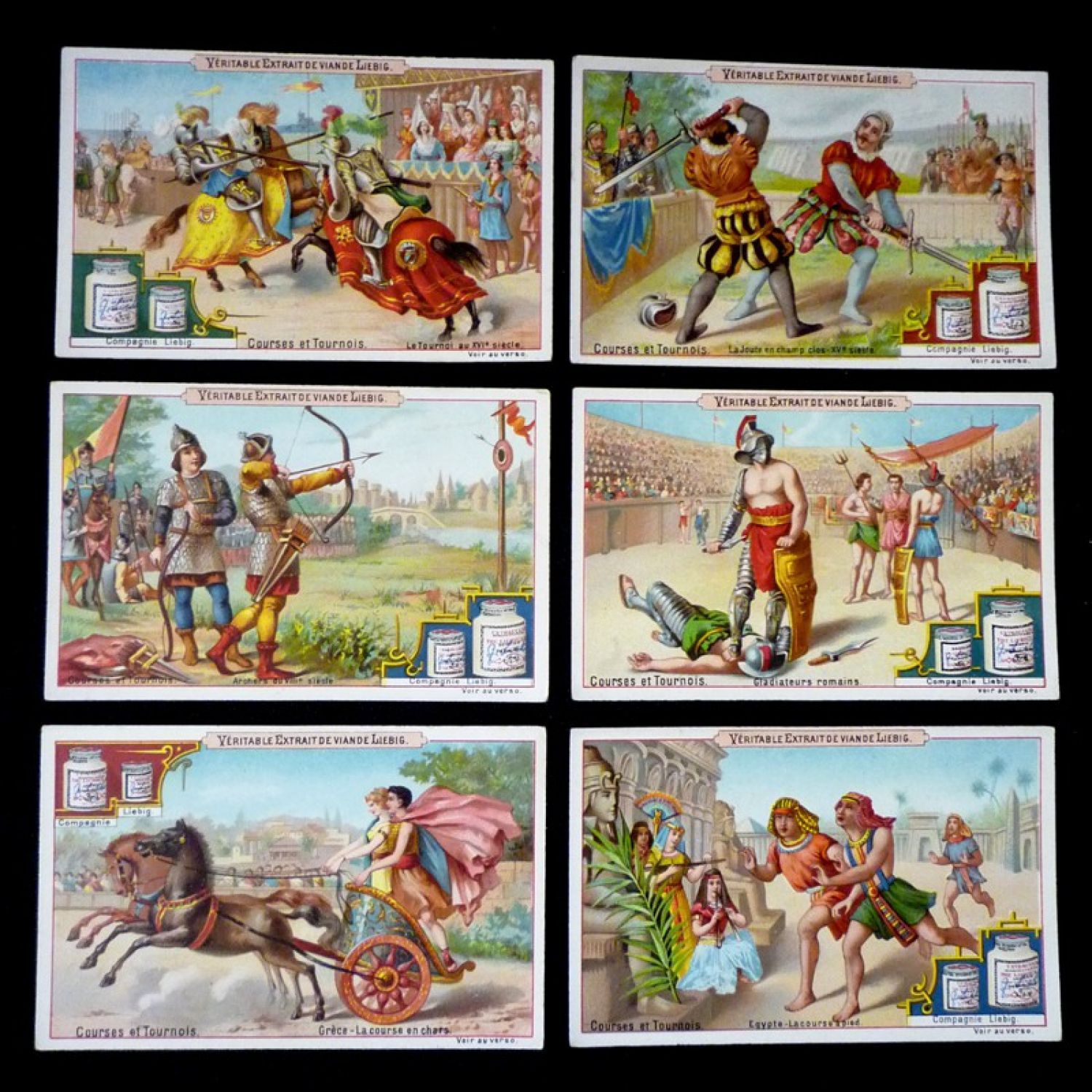 6 chromolithographies publicitaires (11,1 x 7 cm) éditées par la marque Liebig, série complète "Courses et tournois" comprenant les vignettes suivantes : Le tournoi au XVIe siècle ; La joute en champ clos - XVe siècle ; Archers du VIIIe siècle ; Gladiateurs romains ; Grèce - la course en chars ; Egypte - la course à pied ; coins à peine frottés, bel état général.