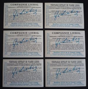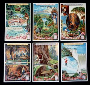 6 chromolithographies publicitaires (11,1 x 7,2 cm) éditées par la marque Liebig, série complète "Les trésors de la terre" comprenant les vignettes suivantes : Recherche de l'ambre...