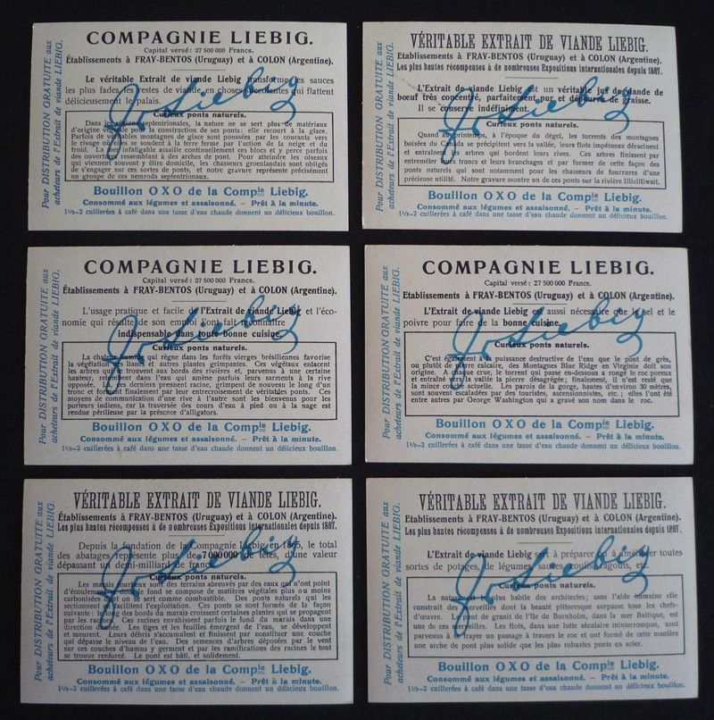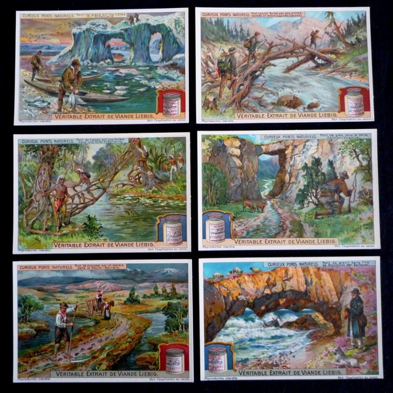 6 chromos publicitaires (10,8 x 7,2 cm) éditées par la marque Liebig, série complète "Curieux ponts naturels" avec l'enveloppe d'origine, comprenant les vignettes suivantes : Pont de glace sur les côtes du Groenland ; Pont de lianes sur une rivière dans une forêt brésilienne ; Pont de mousse sur un marais dans la Haute-Bavière ; Pont naturel formé par des arbres tombés et embroussaillés (Canada) ; Pont de grès dans le White Cannon (Virginie) ; Pont de granit dans l'île de Bornholm (Mer Baltique) ; petites déchirures sur l'enveloppe, par ailleurs bel état.