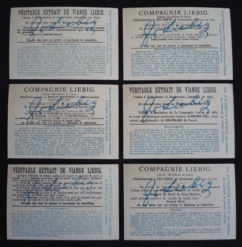 6 chromos publicitaires (10,7 x 7,2 cm) éditées par la marque Liebig, série complète "Episodes de l'histoire de la Belgique" avec l'enveloppe d'origine, comprenant les vignettes suivantes : Godefroy de Bouillon déclinant la royauté de Jérusalem (A. 1099) ; Jean Ier, duc de Brabant, à la bataille de Woeringen (A. 1288) ; Charlemagne visitant les écoles (A. 800) ; Prise de Constantinople par Baudoin IX (A. 1204) ; Sacrifice à la déesse Freya (A. 57 av. J.C.) ; Saint Remi convertissant Clovis au christianisme (A. 490) ; petites déchirures sur l'enveloppe, par ailleurs très bon état.