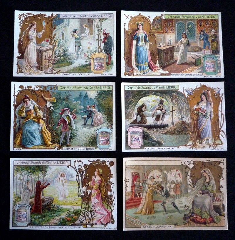 6 chromolithographies publicitaires (10,7 x 7 cm) éditées par la marque Liebig (sauf une, de la Chicorée extra Leroux) série complète "héroïnes littéraires", comprenant les vignettes suivantes : Marguerite (Faust - Geothe) ; Lady Macbeth (Macbeth - Shakespeare) ; Atala (Atala - Chateaubriand) ; Dona Sol (Hernani - Victor Hugo) ; Beatrix (La Divine comédie - Dante Aligheri) ; Chimène (Le Cid - Corneille) ; vignette du Cid brunie, par ailleurs bon état général.