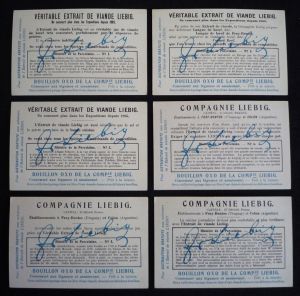 6 chromolithographies publicitaires (7,1 x 10,5 cm) éditées par la marque Liebig, série complète comprenant les vignettes suivantes : Le plus grand fleuve (l'Amazone) ; Les plus hautes montagnes...