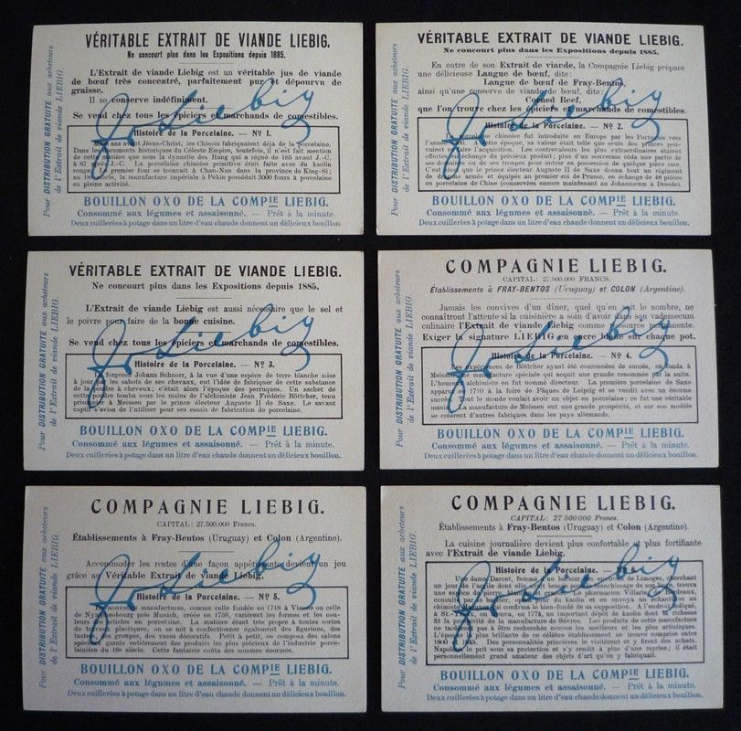 6 chromos Liebig : Histoire de la porcelaine (série complète avec enveloppe d'origine)