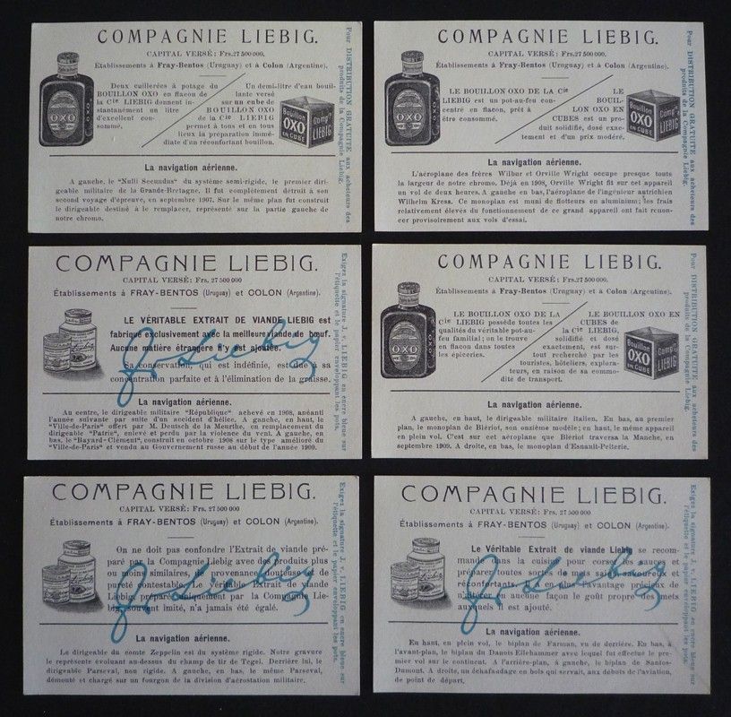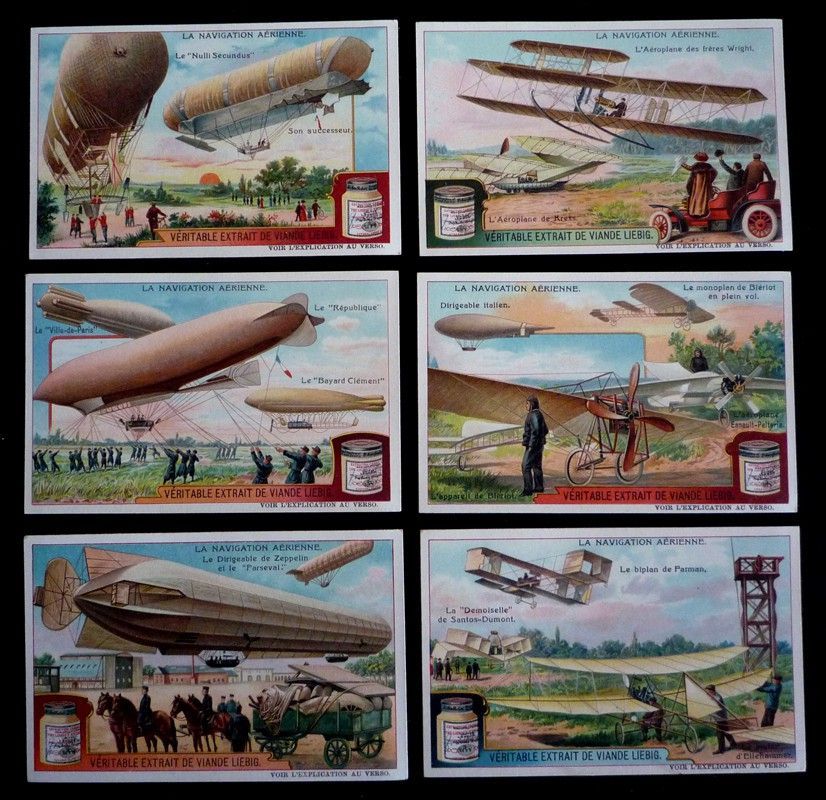 6 chromos publicitaires (11 x 7 cm) éditées par la marque Liebig, série complète "La navigation aérienne" avec l'enveloppe d'origine, comprenant les vignettes suivantes : le Nulli Secundus - son successeur ; l'aéroplane des frères Wright - l'aéroplane de Kress ; le Ville-de-Paris - le République - le Bayard Clément ; dirigeable italien - le monoplan de Blériot en plein vol - l'aéroplane Esnault-Pelterie - l'appareil de Blériot ; le dirigeable de Zeppelin et le Parseval ; le biplan de Farman - le Demoiselle de Santos-Dumont ; déchirure sur l'enveloppe, par ailleurs très bon état.