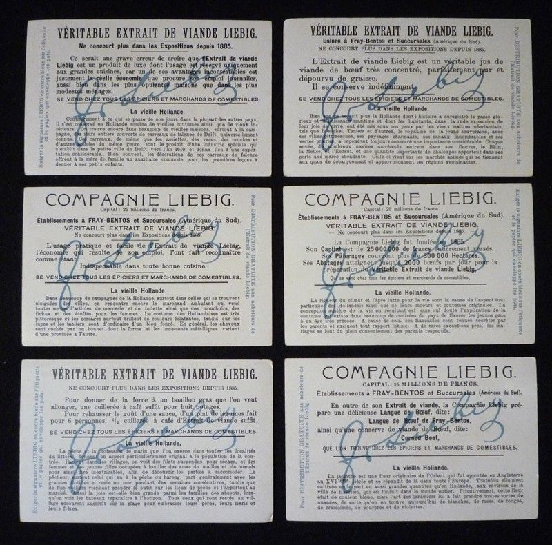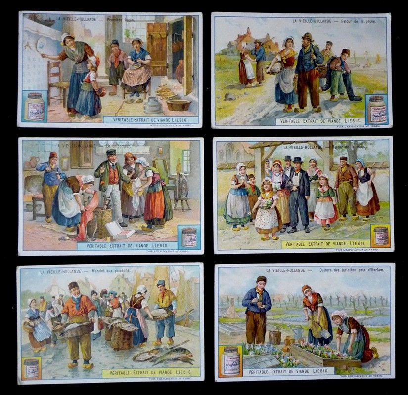 6 chromolithographies publicitaires (11,1 x 7,1 cm) éditées par la marque Liebig, série complète "La Vieille-Hollande", comprenant les vignettes suivantes : Première leçon ; Retour de la pêche ; Le colporteur ; Retour de la noce ; Marché aux poissons ; Culture des jacinthes près d'Harlem ; coins légèrement frottés, bon état.