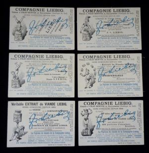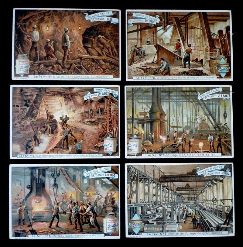 6 chromolithographies publicitaires (10,5 x 7,1 cm) éditées par la marque Liebig, série complète "Le fer" comprenant les vignettes suivantes : 1. La mine - extraction du minerai ; 2. Le bocard - broyage et nettoyage du minerai ; 3. Haut-fourneau - Transformation du minerai en fonte de fer ; 4. Coulage d'objets en fonte de fer ; 5. Marteau-pilon - fabrication du fer ; 6. Atelier de forage de gros canons ; coins légèrement frottés, bon état.