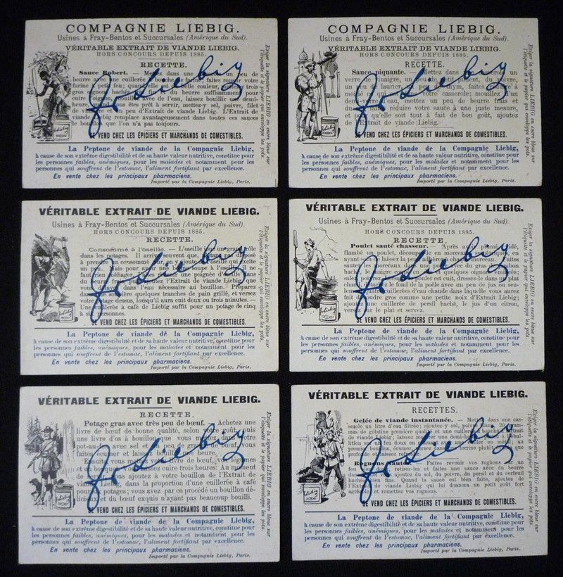 6 chromolithographies publicitaires (7,1 x 10,5 cm) éditées par la marque Liebig, série complète comprenant les vignettes suivantes : Le plus grand fleuve (l'Amazone) ; Les plus hautes montagnes (l'Himalaya ; La plus grande grotte (la Caverne des Mammouths) ; le plus grand volcan (l'Etna) ; les plus grands arbres (le Sequoia) ; la plus grande chute d'eau (Niagara) ; coins à peine frottés, très bon état.
