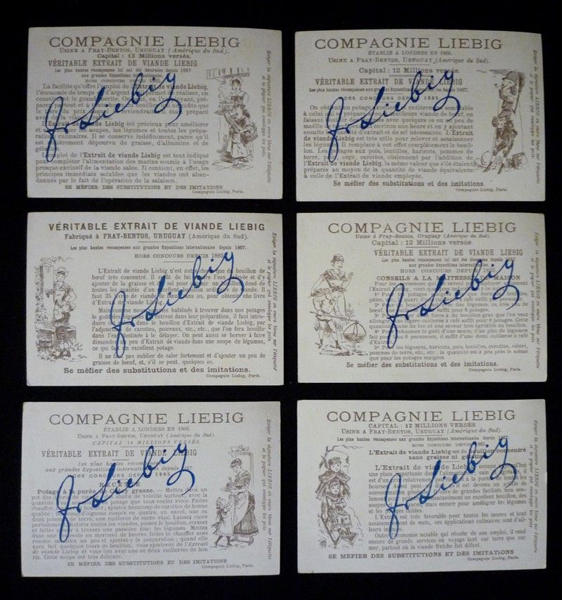 6 chromolithographies publicitaires (10,5 x 7,1 cm) éditées par la marque Liebig, série complète de vignettes représentant des scènes marines et portraits à l'intérieur de différents...