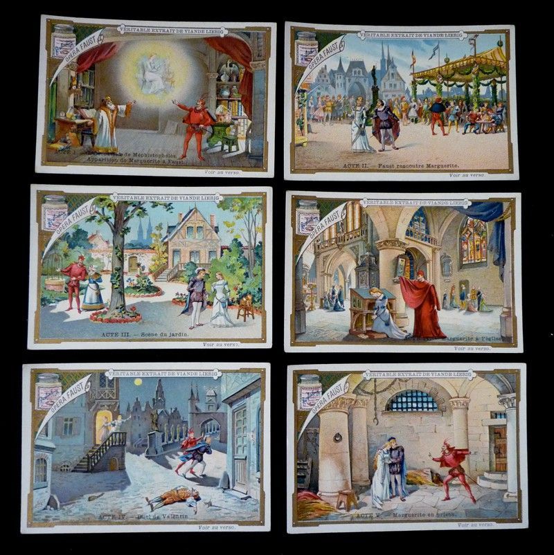 6 chromolithographies publicitaires (10,7 x 7,3 cm) éditées par la marque Liebig, série complète "Opéra Faust", comprenant les vignettes suivantes : Acte I - L'évocation de Méphistophéles. Apparition de Marguerite à Faust ; Acte II - Faust rencontre Marguerite ; Acte III - Scène du jardin ; Acte IV - Marguerite à l'église ; Acte IV - Duel de Valentin ; Acte V - Marguerite en prison ; coins légèrement frottés, par ailleurs bel état général.