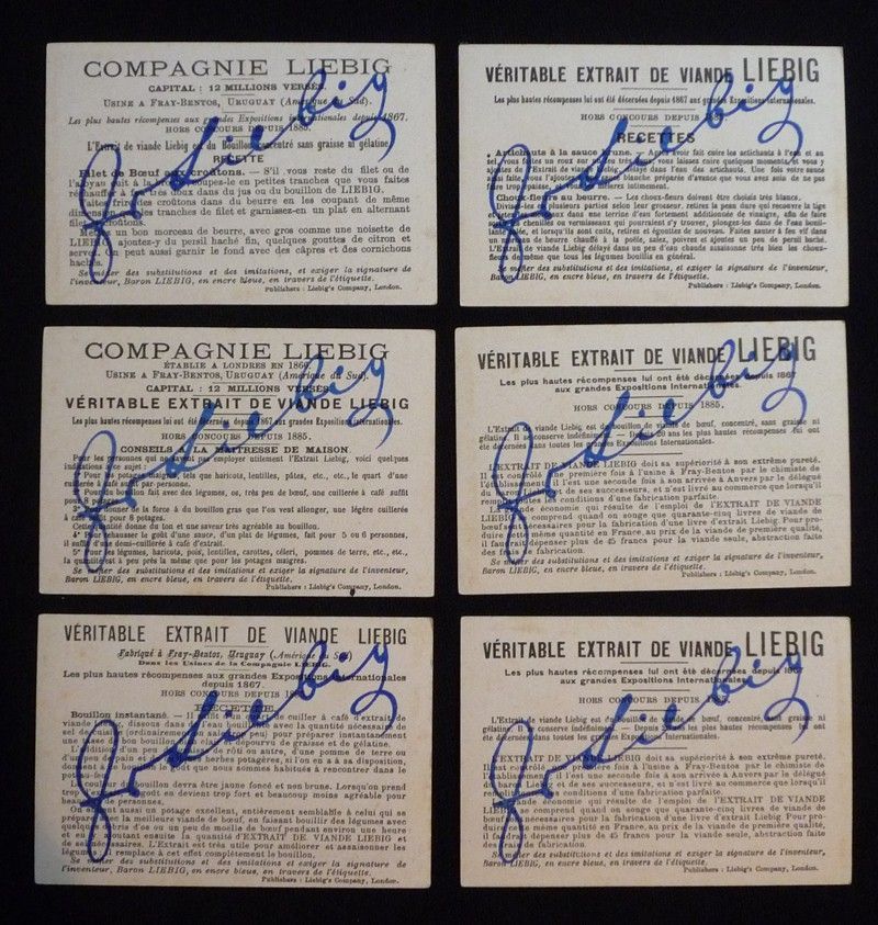 6 chromolithographies publicitaires (10,4 x 7,1 cm) éditées par la marque Liebig, série complète "Proverbes" comprenant les vignettes suivantes : Il n'est pire sourd que celui qui ne veut pas entendre ; Bière qui roule n'amasse pas mousse ; Qui se ressemble s'assemble ; Le chat parti, les souris dansent ; L'occasion fait le larron, ou qui dort dîne ; Tell père, Tell fils ; bel état.