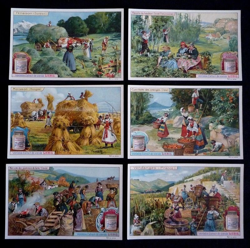 RARE. 6 chromos publicitaires (11 x 7 cm) éditées par la marque Liebig, série complète "Récoltes" avec l'enveloppe d'origine, comprenant les vignettes suivantes : Fenaison (Suisse) ; Moisson (Hongrie) ; Récolte des pommes de terre (Irlande) ; Récolte du houblon (Suisse franconienne) ; Cueillette des oranges (Italie) ; Vendanges (France) ; petites déchirures sur l'enveloppe, par ailleurs très bon état.
