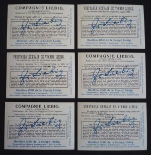 6 chromos publicitaires (10,7 x 7,2 cm) éditées par la marque Liebig, série complète "Vieilles églises célèbres" avec l'enveloppe d'origine, comprenant les vignettes suivantes : 1. Le cortège du couronnement d'Olaf quitte la cathédrale de Trondhjem (en 1017) ; 2. Cortège solennel après un service à Notre-Dame de Paris sous Charles VII (en 1437) ; 3. Distribution du "don pascal" à Moscou, devant l'église Vassili-Blagennot (bâtie en 1554) ; 4. Transport de la cloche de la cathédrale St. Etienne à Vienne (en 1711) ; 5. Aldermen londoniens en conversation devant l'abbaye de Westminster (vers 1750) ; 6. Inauguration de la cathédrale de Cologne (en 1880) ; petites déchirures sur l'enveloppe, par ailleurs très bon état.
