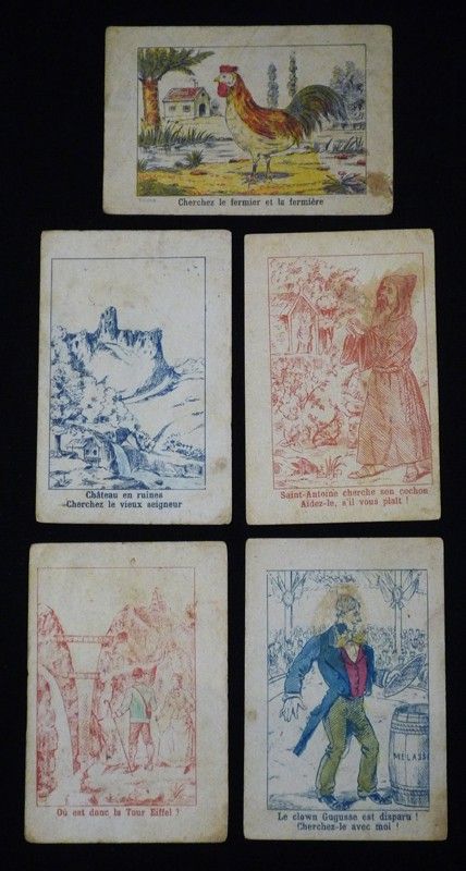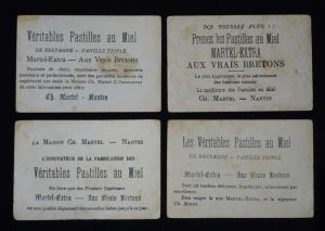 9 chromos devinettes publicitaires (7,7 x 11,8 cm) pour les pastilles au miel "aux vrais bretons" de Ch. Martel ; vignettes légèrement défraîchies, coins frottés, assez bon état général.